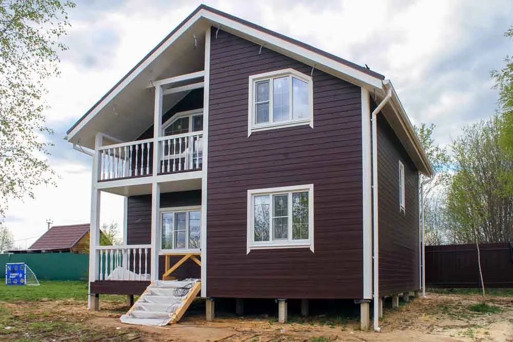 При стандартной комплектации, каркасный дом обшивается снаружи имитацией бруса, толщиной 16-18 мм. Возможна замена имитации бруса на блокхаус.